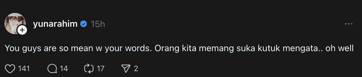 Menerusi satu hantaran di platform Threads, Yuna menyifatkan sesetengah pengguna media sosial terlalu bebas menghamburkan kritikan hingga mampu memberi kesan emosi kepada individu yang menjadi sasaran.