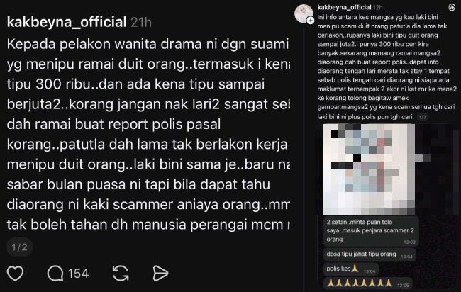 “Kepada pelakon wanita drama ni dgn suami dia yang menipu ramai duit orang termasuk i kena tipu 300 ribu. Ada kena tipu sampai berjuta2.