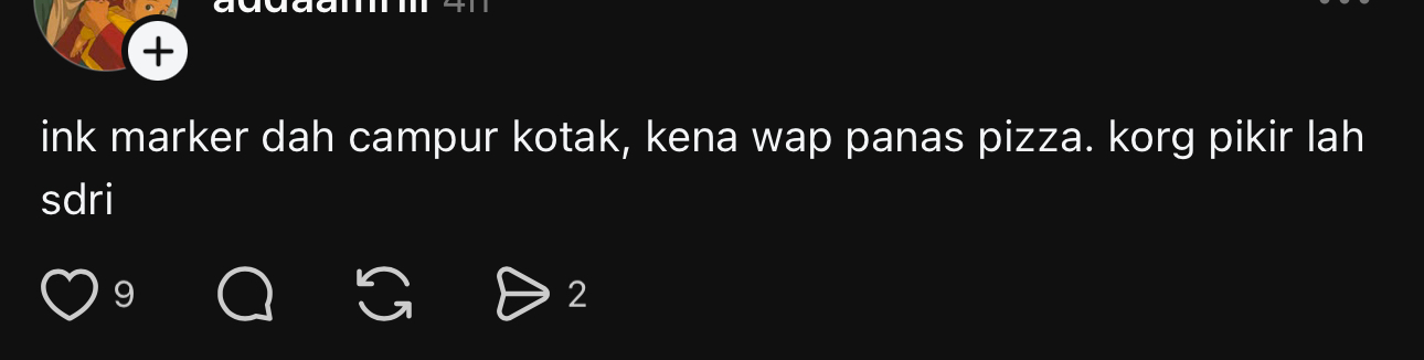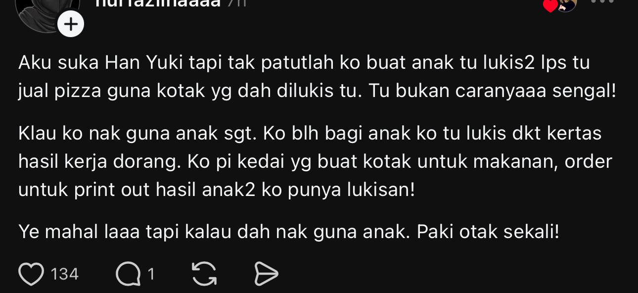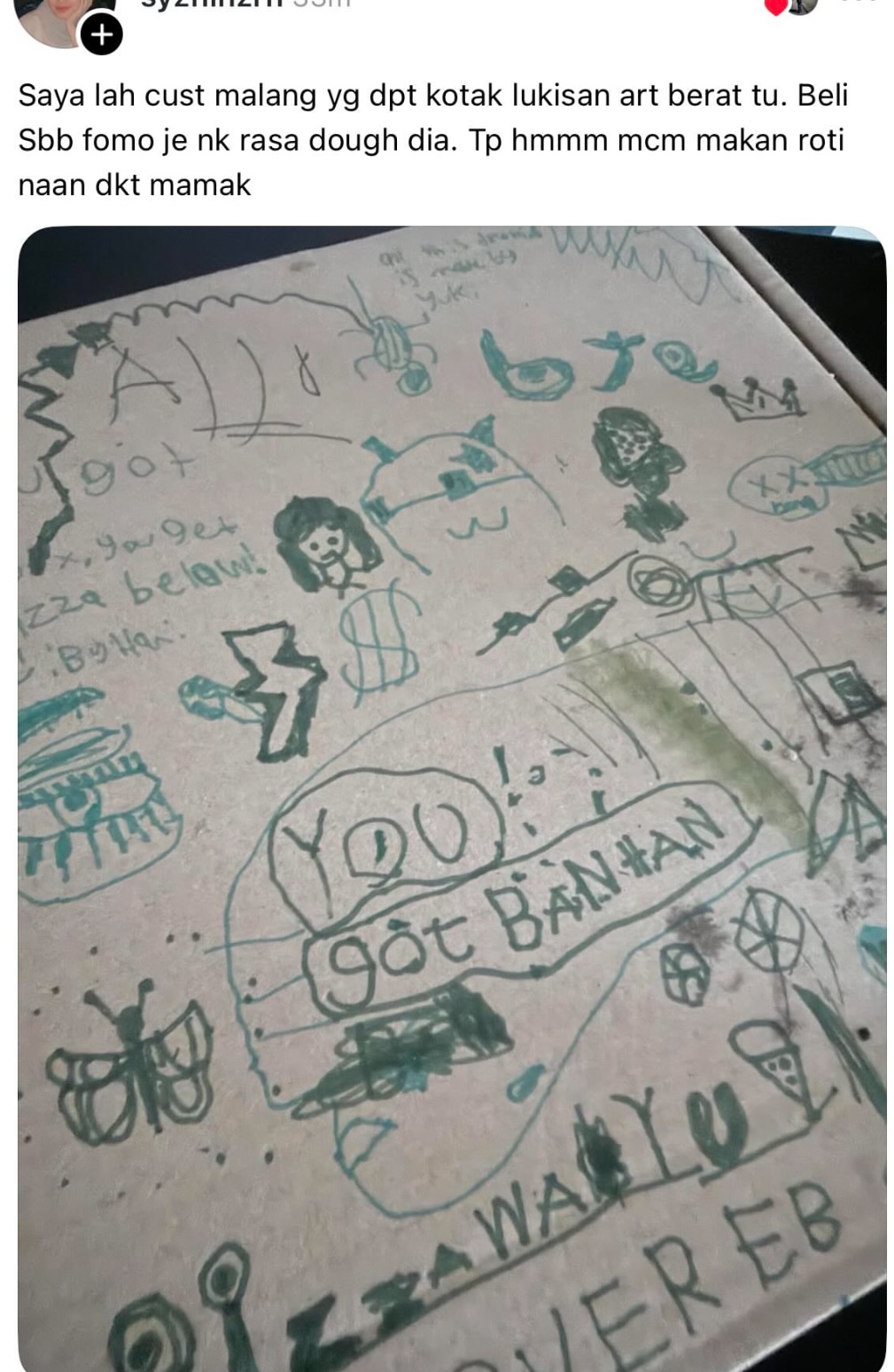 Malah, kata pelanggan wanita itu, selain daripada rasa piza, dia juga berasa kurang senang dengan kotak makanan yang diterimanya kerana terdapat contengan lukisan, atau ramai menggelarkannya sebagai sebagai ‘art berat’ yang dilukis dengan menggunakan marker pen.