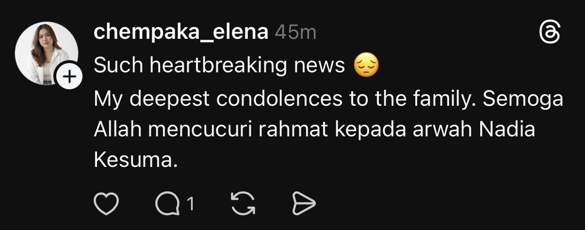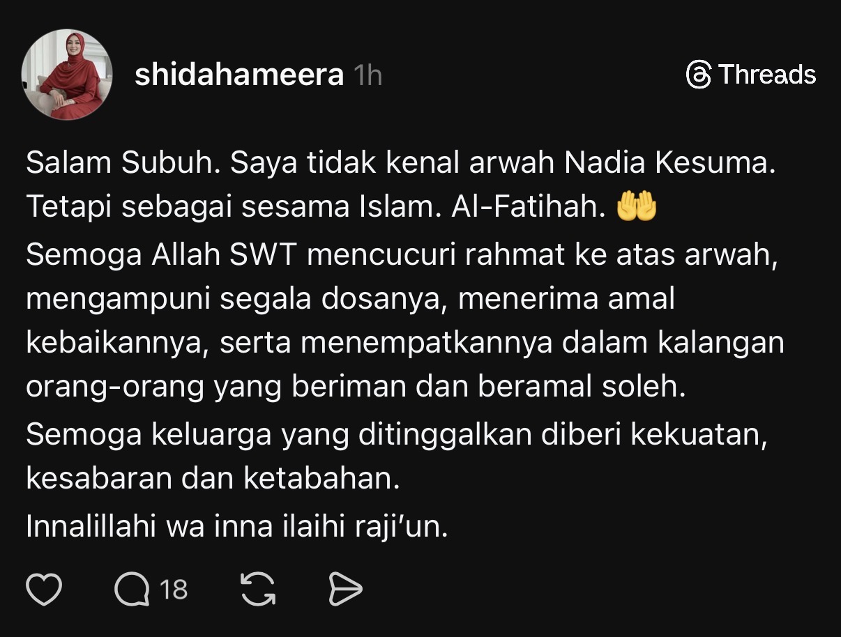 “Saya tidak kenal arwah Nadia Kesuma tetapi sebagai sesama Islam saya amat terkejut, Al-Fatihah.