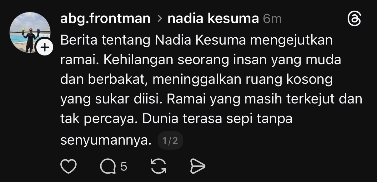 “Kita kehilangan seorang insan yang muda dan berbakat, meninggalkan ruang kosong yang sukar diisi. Ramai yang masih terkejut dan tak percaya. Dunia terasa sepi tanpa senyumannya,” komen netizen.