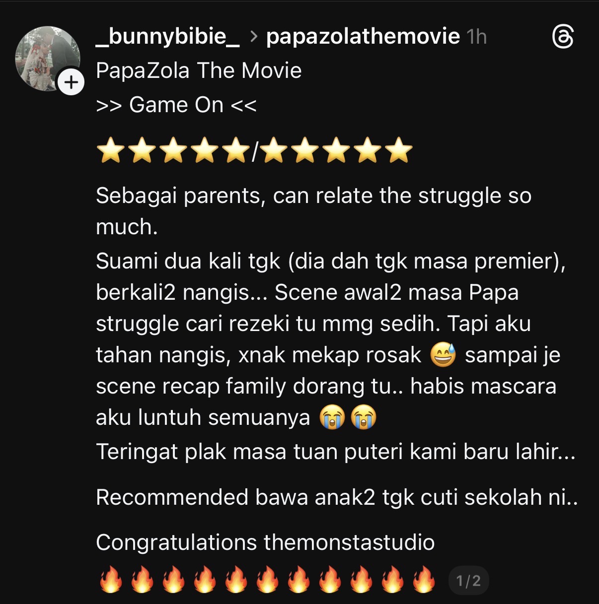 “Sebagai ibu ayah, dapat kaitkan jalan cerita Papa Zola The Movie dengan kehidupan. Babak Papa Zola bersusah payah cari rezeki berjaya buatkan kami menitiskan air mata.