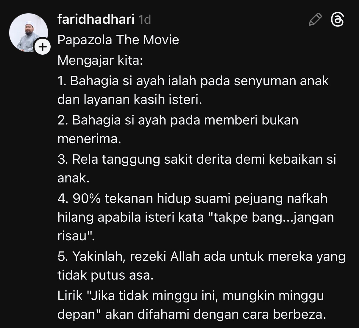 Menerusi Threads, rata-rata warganet beranggapan jalan cerita filem keluaran MONSTA dan Astro Shaw itu begitu dekat dengan susah payah yang dihadapi seorang figura bergelar ayah.