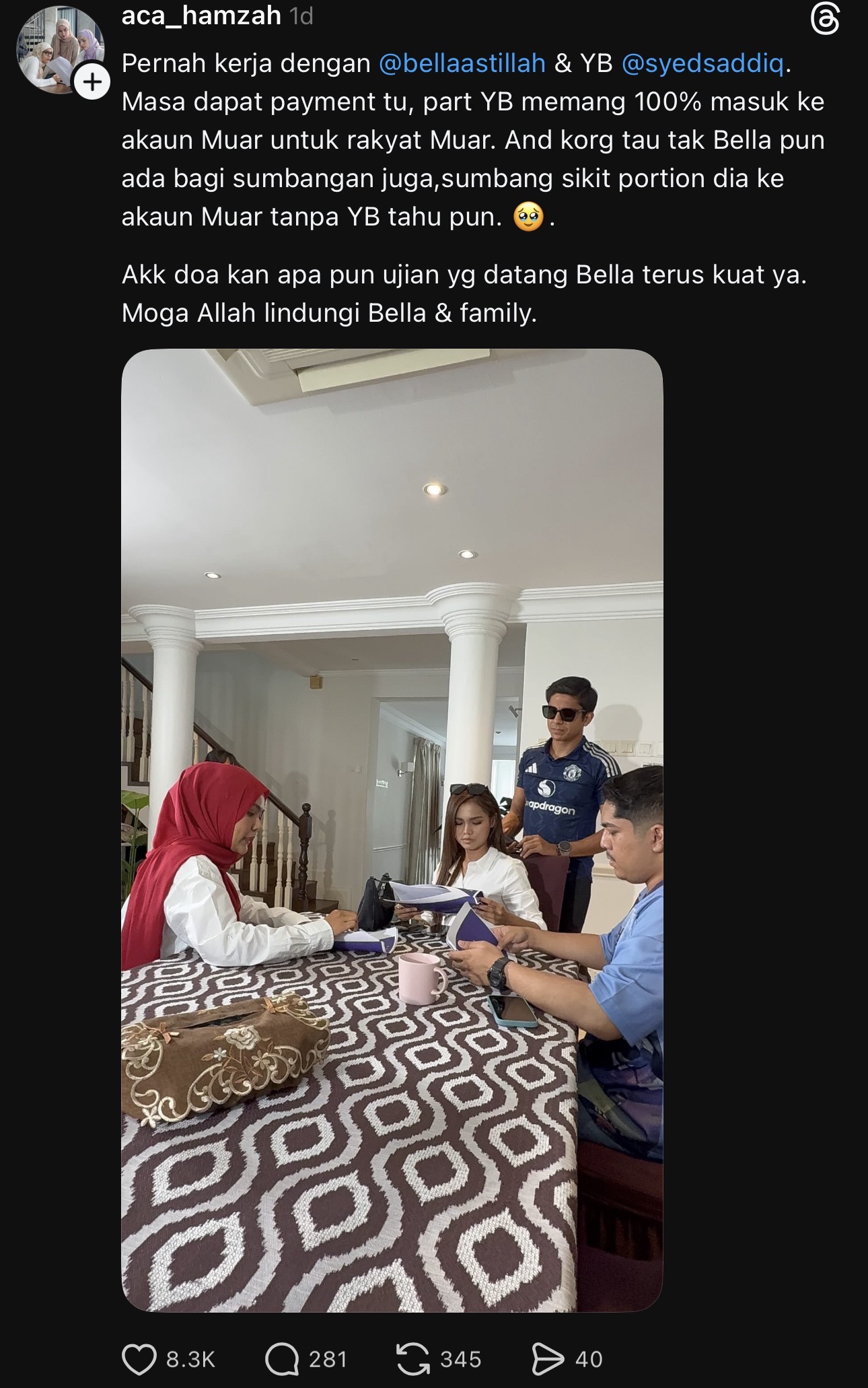 “Pernah kerja dengan @bellaastillah dan YB @syedsaddiq. Masa dapat payment tu, part YB memang 100% masuk ke akaun Muar untuk rakyat Muar.