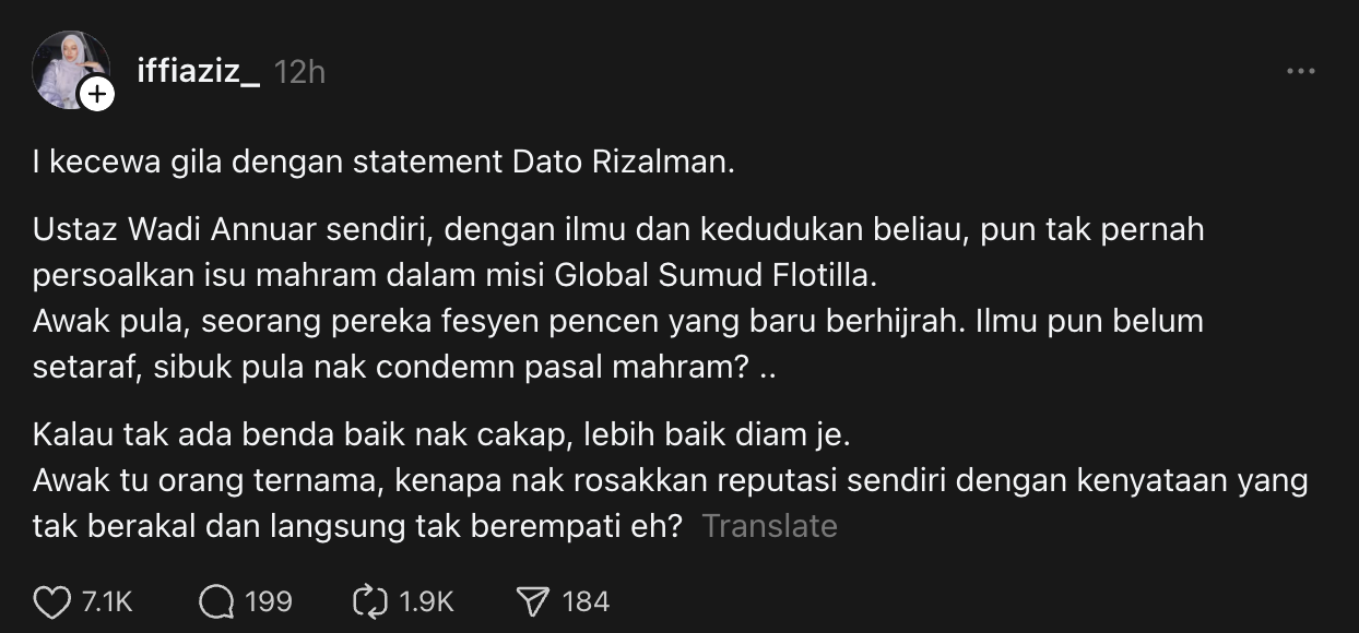 Seorang individu meluahkan rasa kecewa dengan kenyataan yang dikeluarkan oleh pereka fesyen terkenal, Datuk Rizalman Ibrahim mengenai isu mahram dalam misi Global Sumud Flotilla (GSF).