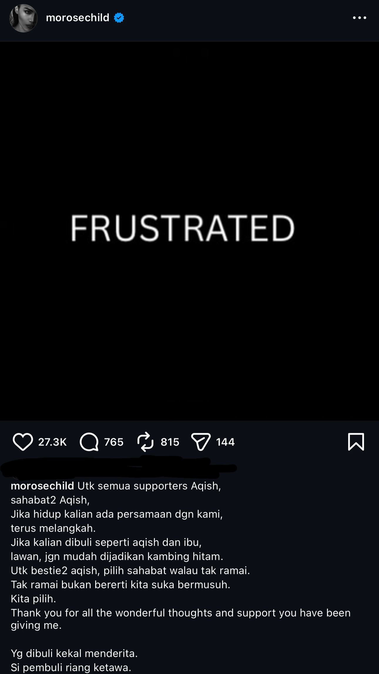 “Jika kalian dibuli seperti aqish dan ibu, lawan, jangan mudah dijadikan kambing hitam,” serunya menerusi hantaran di akaun Instagram miliknya.