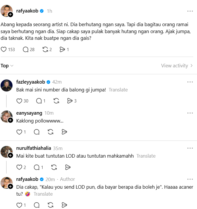 • Raf Yaakob berkongsi isu hutang melibatkan seorang individu yang didakwa abang kepada artis tempatan menerusi Threads, yang menjadi tular di kalangan netizen.