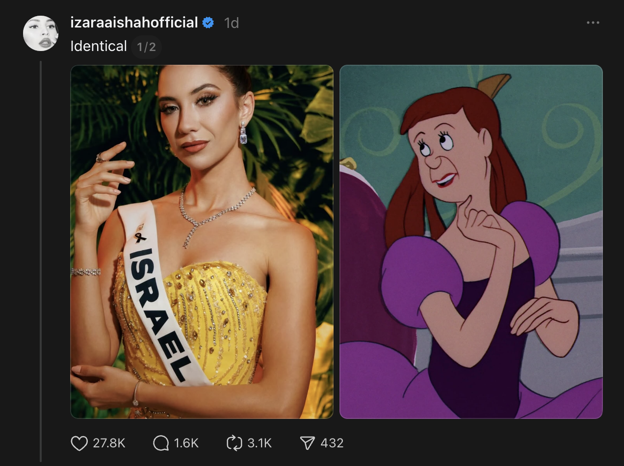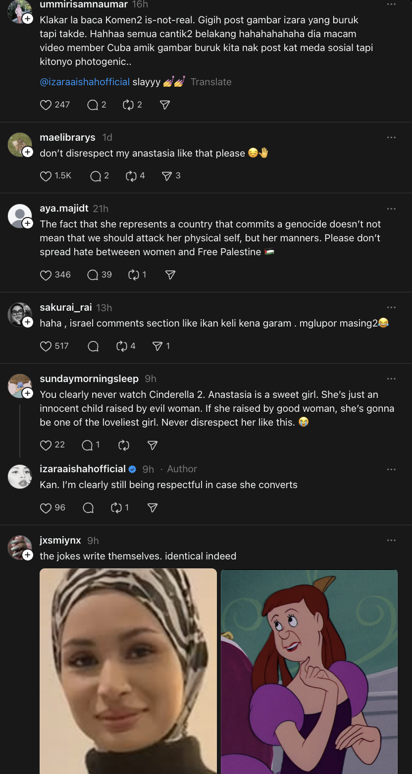Menerusi hantaran di platform Threads, Izara secara berseloroh menyamakan wajah ratu cantik tersebut dengan watak animasi popular, Cinderella iaitu Anastasia.