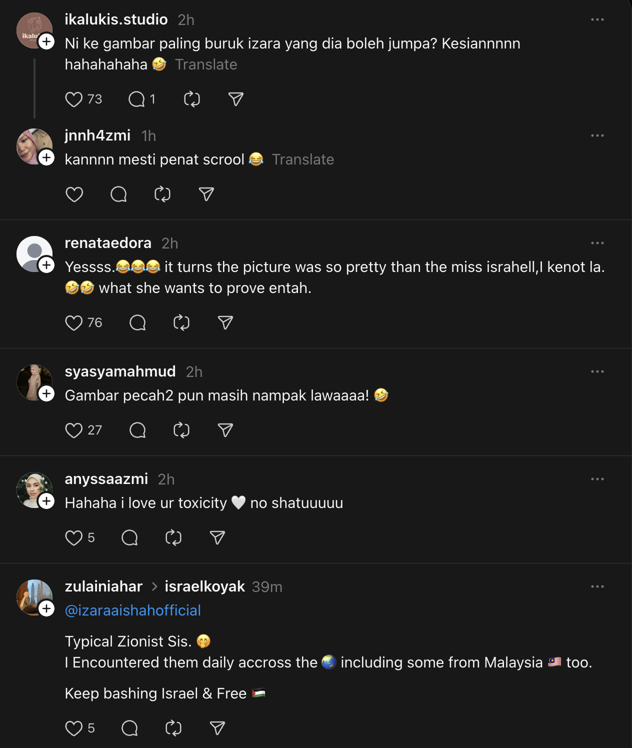 Difahamkan ada beberapa netizen daripada Israel cuba mencari gambar 'buruk' Izara namun gagal.
