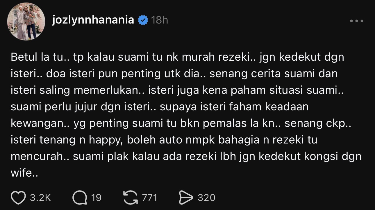 Ramai Setuju Pandangan Ozlynn Tentang Rezeki, Saling Memahami Kunci Rumah Tangga - “Suami Perlu Jujur Supaya Isteri Faham Keadaan Kewangan…”