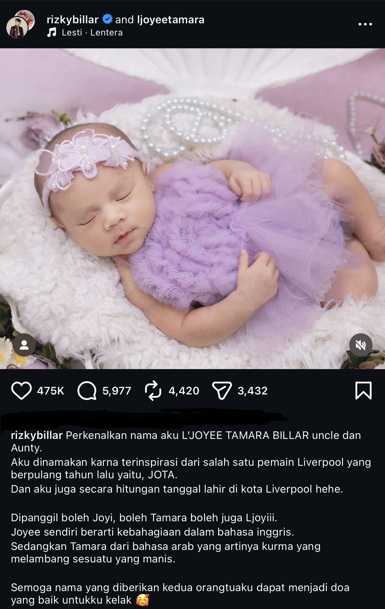 Dalam pada itu, Rizky juga turut berkongsi makna disebalik pemilihan nama L’Joyee Tamara Billar.