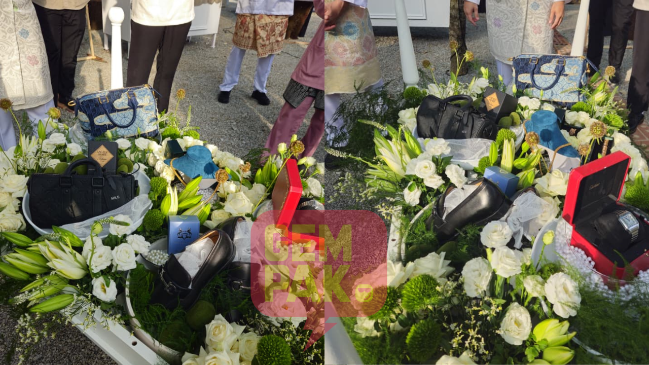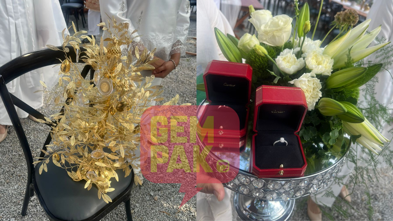 Antara hantaran yang disatukan dalam satu talam tersebut termasuk sepohon pokok emas seberat 102 gram, sepersalinan emas, tas tangan, kasut dan jam tangan.