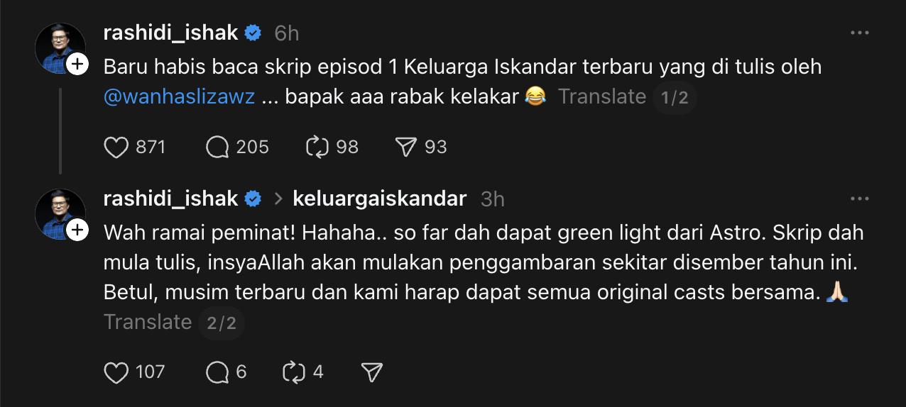 Menerusi hantaran di platform Threads, Rashidi mendedahkan dia baru sahaja selesai membaca skrip episod pertama yang ditulis oleh pengarah dan penulisl, Wan Hasliza Wan Zainuddin.