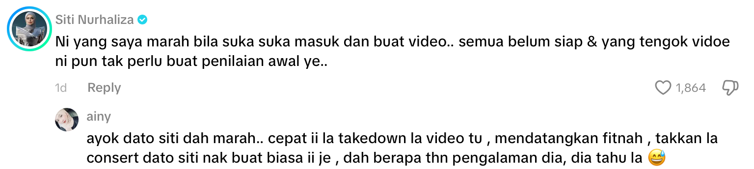 Hantaran itu kemudiannya mendapat respon daripada Siti yang beranggapan video tersebut boleh mencetuskan pelbagai spekulasi sedangkan pentas konsert tersebut masih dalam proses pembinaan.