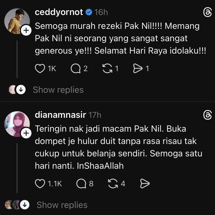 • Perkongsian di Threads itu mendapat pujian ramai atas sikap pemurah Pak Nil dan harapan agar lebih ramai dapat mencontohinya.