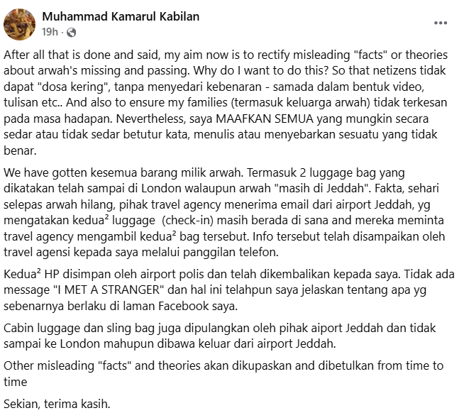 “Fakta, sehari selepas arwah hilang, pihak travel agency menerima email dari airport Jeddah yang mengatakan kedua luggage (check-in) masih berada di sana dan mereka meminta travel agency mengambil kedua bag tersebut,” jelasnya.