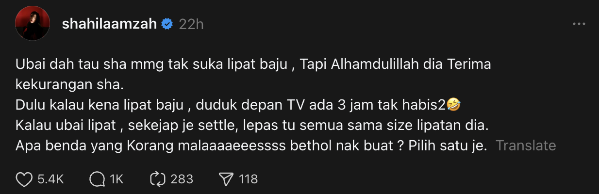 “Ubai dah tahu Sha memang tak suka lipat baju, tapi Alhamdulillah dia terima kekurangan Sha.