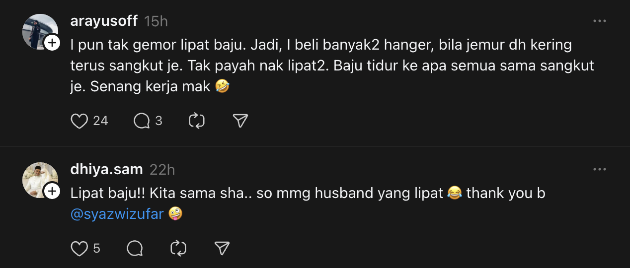 Pelantun lagu Patah Seribu itu turut mengajak pengikutnya di media sosial berkongsi pendapat tentang kerja rumah yang paling mereka malas lakukan.