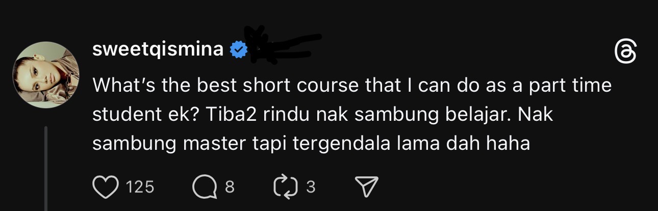 Menerusi satu perkongsian platform Threads, Sweet bertanyakan pandangan mengenai kursus jangka pendek yang sesuai untuk diikuti secara separuh masa.