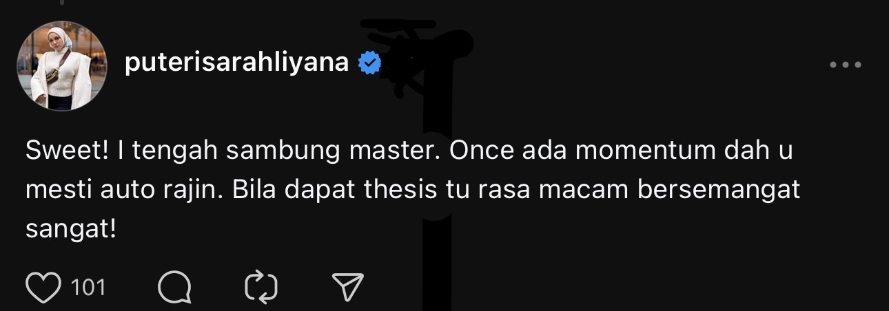 “Tiba-tiba rindu nak sambung belajar. Nak sambung master tapi tergendala lama dah haha,” kongsinya.