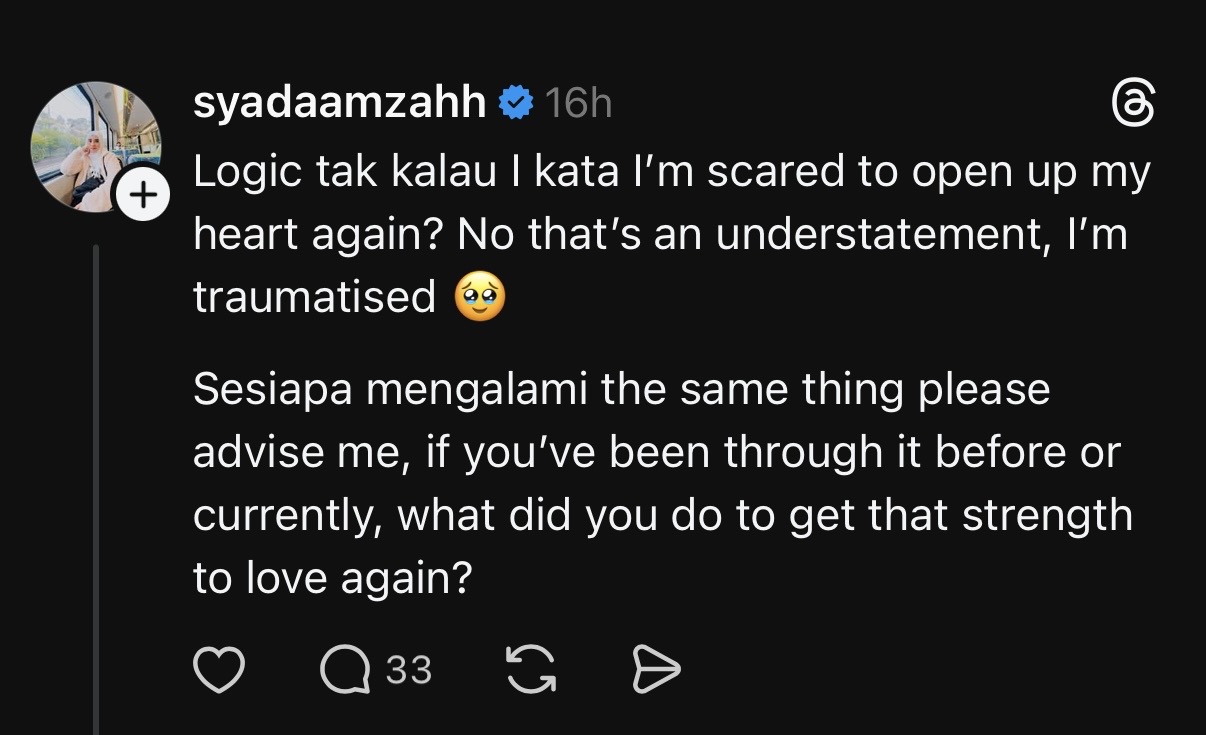 - Syada Amzah berkongsi rasa trauma dan takut untuk membuka hati serta bercinta semula di platform Threads.