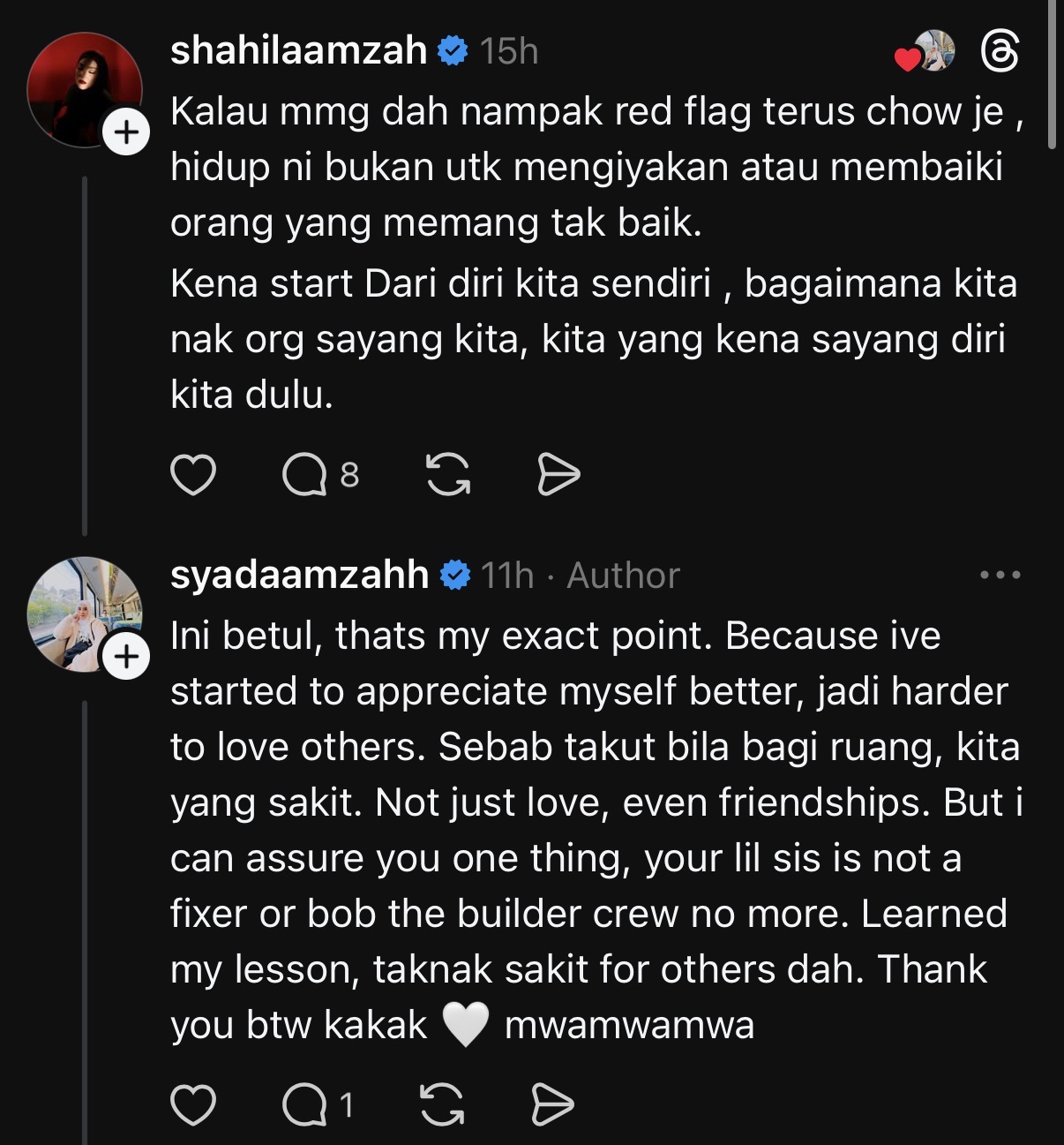 - Kakaknya, Shila Amzah, memberi nasihat supaya sayang diri sendiri dan elak hubungan yang ada 'red flag'.