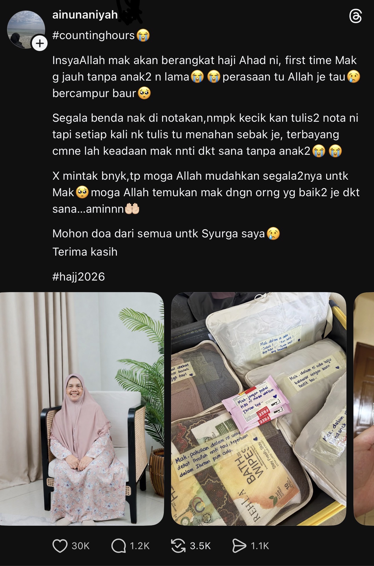 Seorang pengguna media sosial yang dikenali sebagai Ainunaniyah menjadi tular di media sosial selepas berkongsi persiapan menunaikan haji buat ibunya untuk tahun ini.