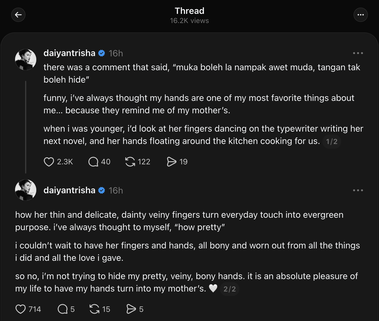 "Jadi tidak, saya tidak cuba menyembunyikan tangan saya yang berurat dan bertulang ini. Ia adalah satu penghormatan dalam hidup saya apabila tangan ini semakin menyerupai tangan ibu saya,” tambahnya.