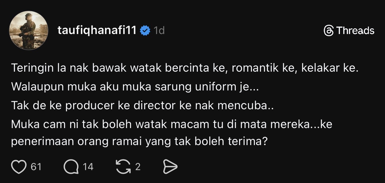 Taufiq yang meluahkan hasrat tersebut menerusi hantaran di platform Threads berkata dia teringin untuk membawa karakter yang lebih ringan seperti watak romantik, bercinta atau pun komedi, meskipun menyedari raut wajahnya sering dikaitkan dengan karakter beruniform