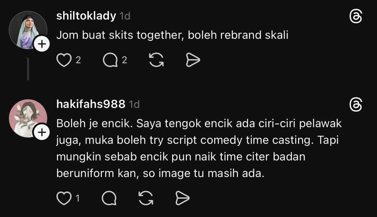 “Teringin lah nak bawak watak bercinta ke, romantik ke, kelakar ke. Walaupun muka aku muka sarung uniform je,” luahnya.