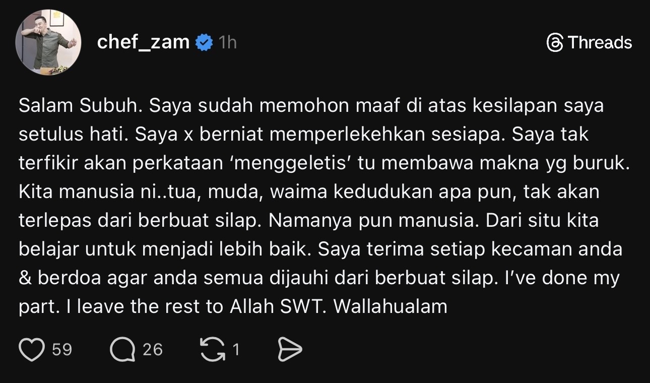 • Chef Zam menjelaskan tiada niat untuk memperlekehkan sesiapa dan menerima segala teguran dengan hati terbuka.