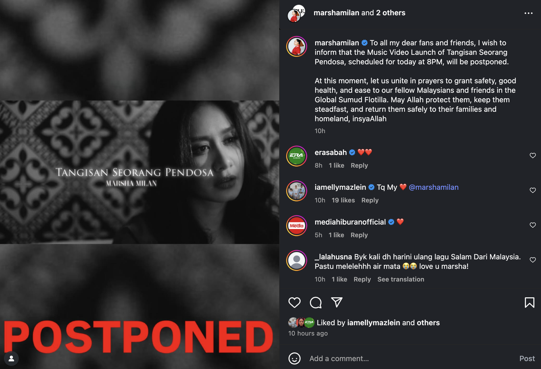 Penyanyi, Marsha Milan mengambil keputusan untuk menangguhkan pelancaran muzik video (MV) terbaharunya berjudul Tangisan Seorang Pendosa.