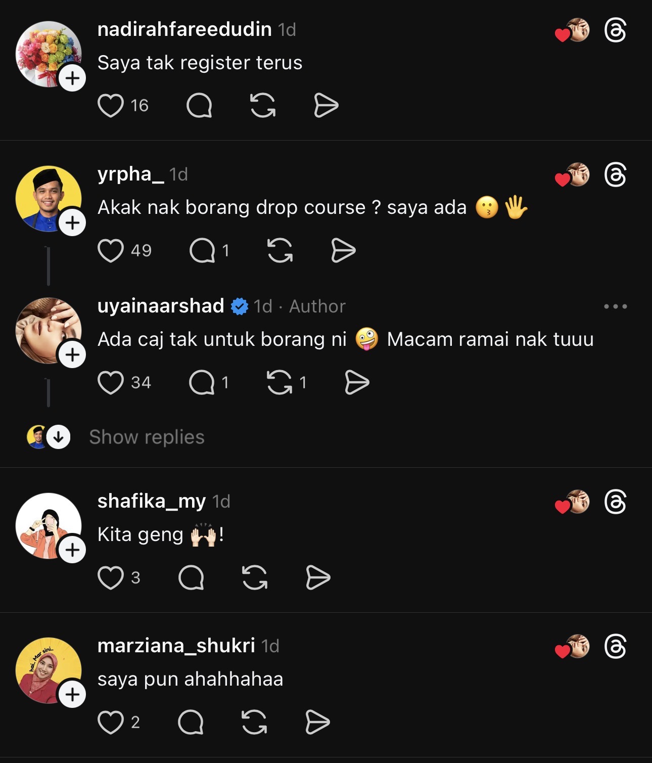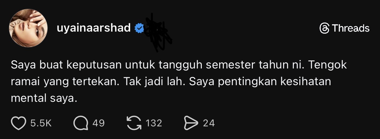 Menerusi hantaran di platform Threads, Uyaina berkata dia membuat keputusan untuk menangguhkan hasrat berkenaan selepas melihat ramai yang tertekan dengan ‘silibus’ tahun ini.