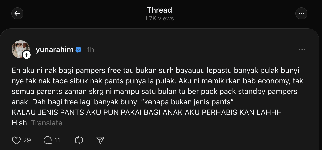 Terdahulu, Yuna meluahkan rasa terkilan di Threads apabila ada segelintir pihak meminta barang keperluan bayi di luar tawaran yang diberikan olehnya.