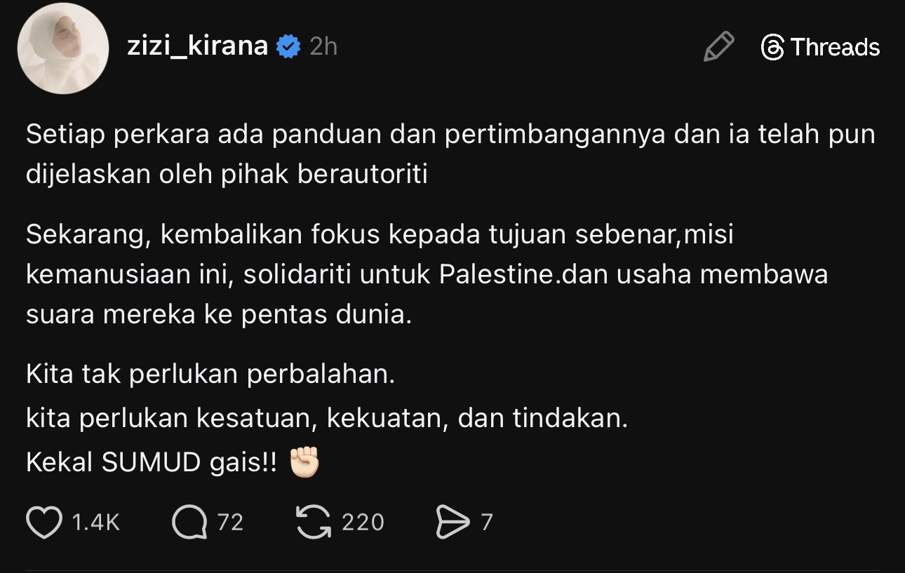 Sebaliknya, Zizi mengajak semua pihak untuk kembali kepada matlamat asal iaitu misi kemanusiaan dan solidariti terhadap rakyat Palestin.
