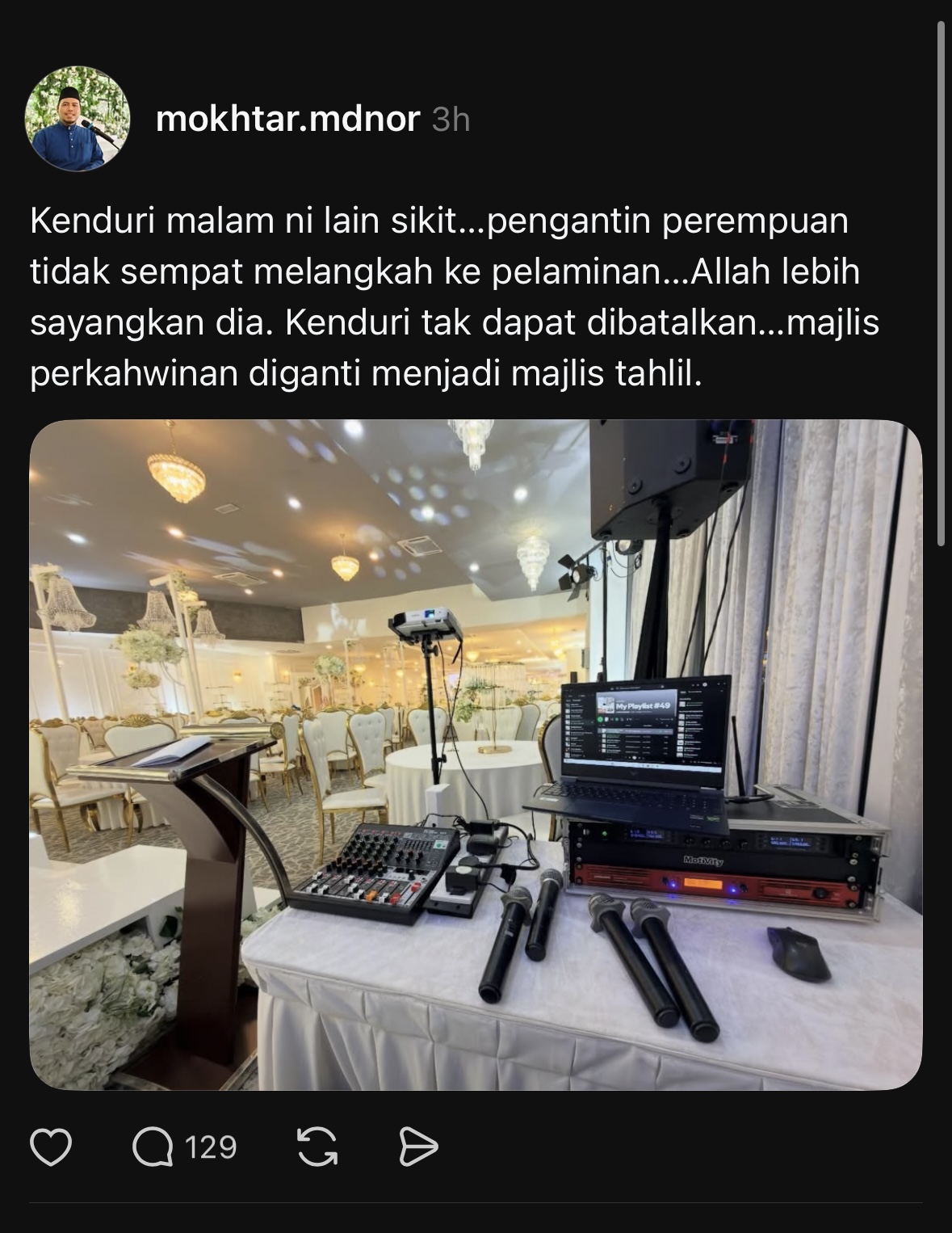 Menerusi ciapan dibuat seorang lelaki dikenali sebagai @mokhtar.mdnor, majlis tersebut walau bagaimanapun tetap diteruskan dalam keadaan penuh sayu.