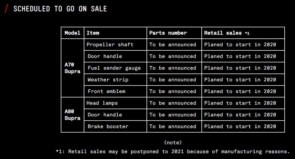 Parts that are under the initiative comprise propeller shaft, door handles, fuel sender gauge, weatherstrips and front emblems for the A70 while the A80 will get headlights, door handles and the brake booster reproduced.