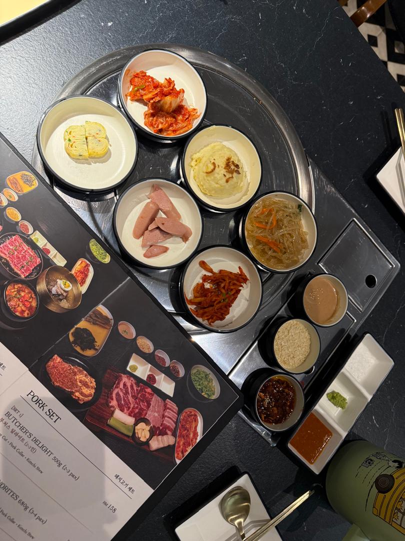 Before the grill is lit, the table is filled with a spread of side dishes and accompaniments that set expectations for the meal. Alongside familiar offerings like white kimchi and assorted pickled vegetables are several sauces intended to frame, rather than dominate, the meat.