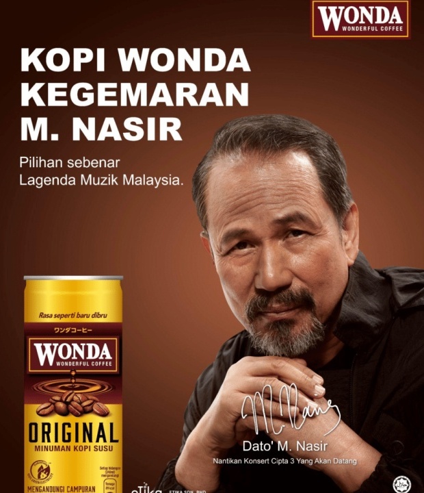 In the ad featuring M. Nasir, WONDA writes, “KOPI WONDA kegemaran M. Nasir. Pilihan sebenar Lagenda Muzik Malaysia” (“WONDA COFFEE is M. Nasir’s favourite. The real choice of Malaysia’s Music Legend”), along with his signature.