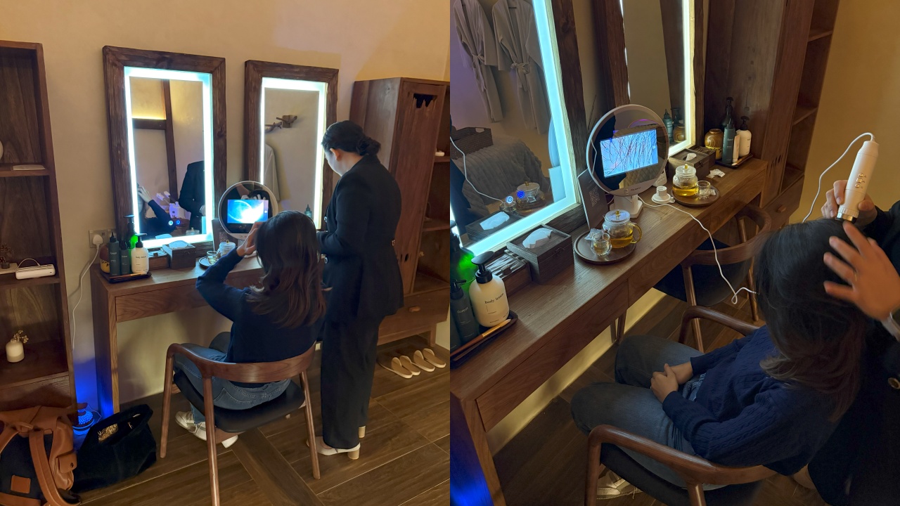 The Premium Head Spa + Hydro Facial at KANTIK by GOYO begins with an AI-powered scalp analysis that magnifies the scalp to reveal hydration levels, oil buildup, and areas of sensitivity, allowing the therapist to map out pressure points and adjust the treatment plan using data.