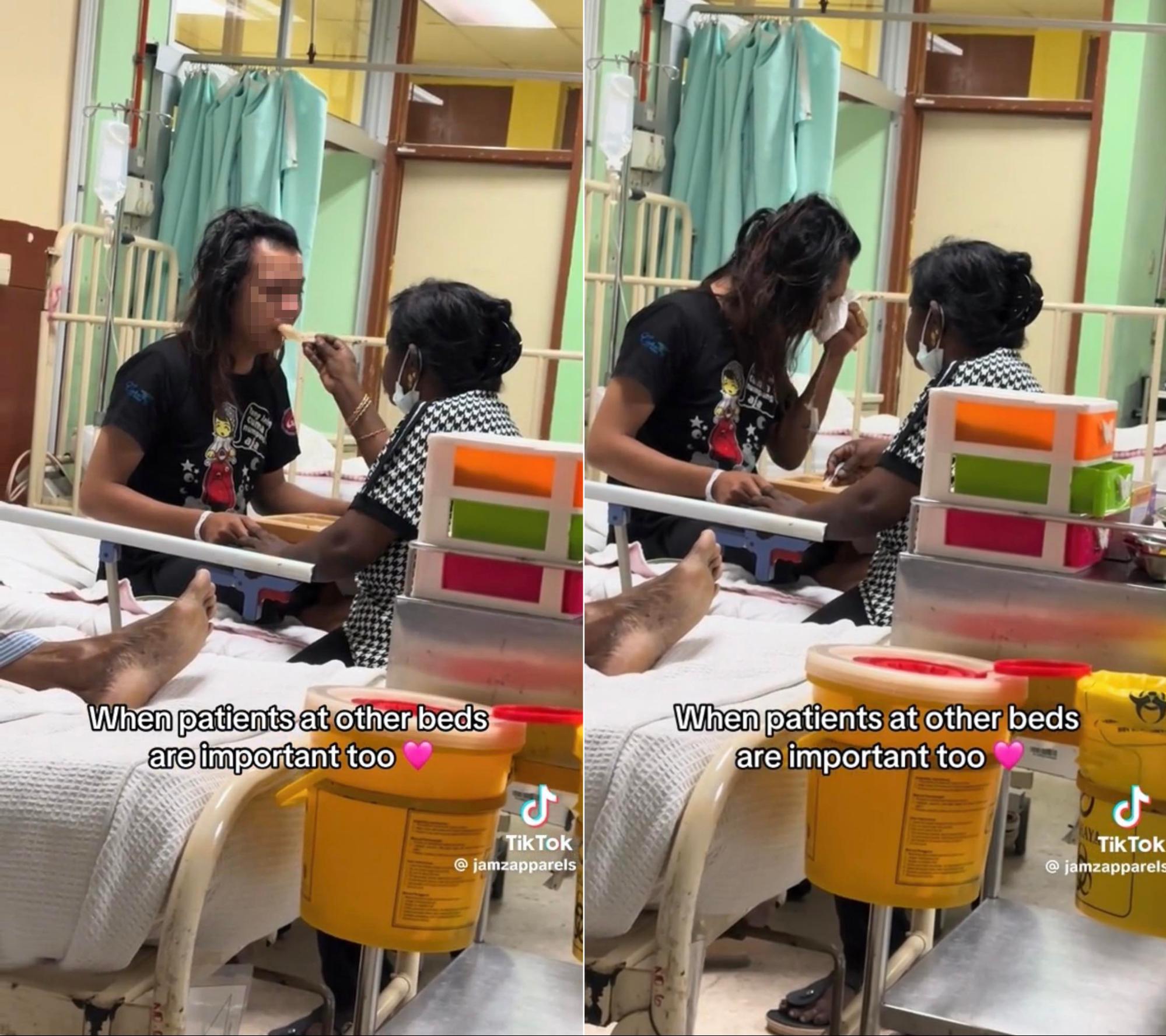In a video posted on TikTok, the aunty was seen sitting on a man's hospital bed and gently spoon-feeding him. Touched by the act of kindness, the man could be seen wiping his teary eyes with a tissue.