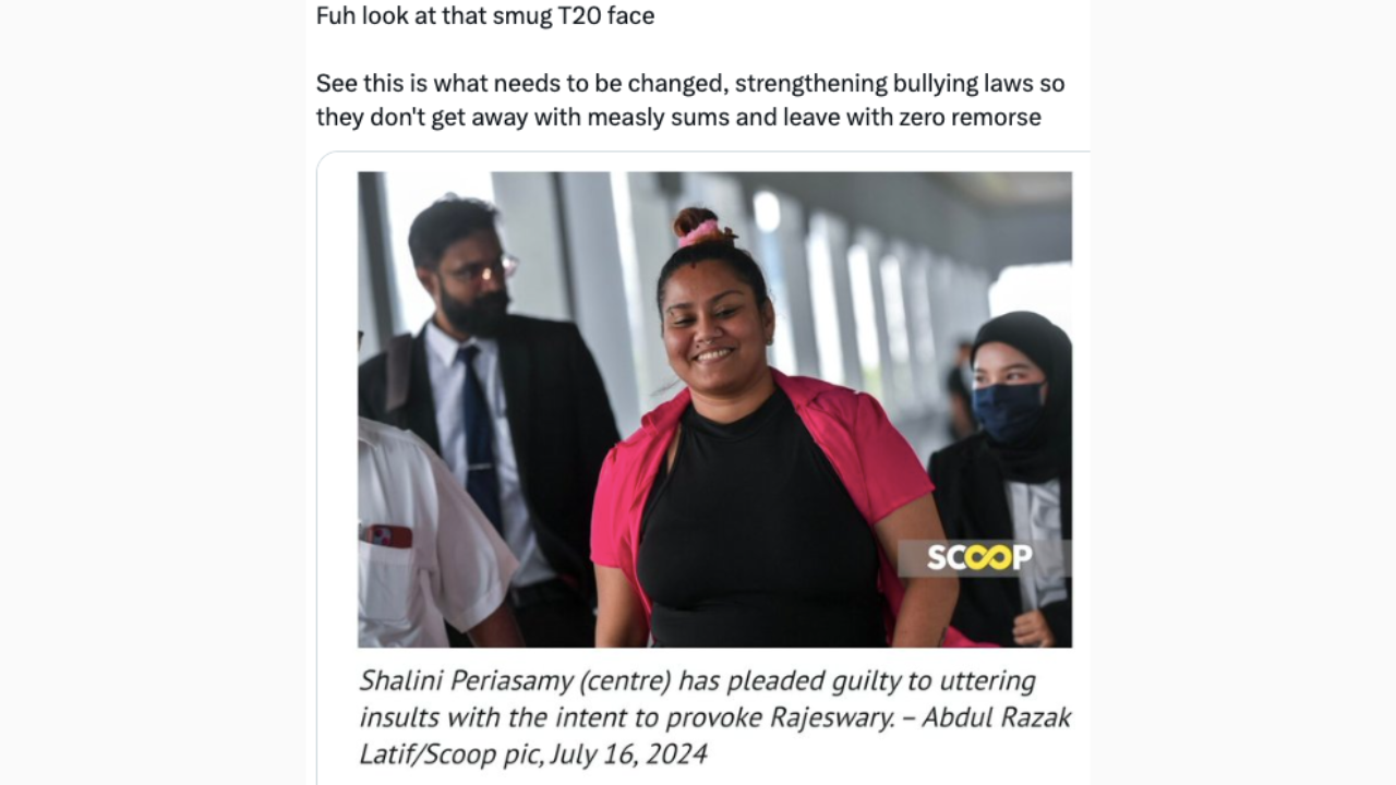 An X user said P. Shalini appeared smug when she exited the court and added, “See, this is what needs to be changed, strengthening bullying laws so they don't get away with measly sums and leave with zero remorse.” She added in the thread that P. Shalini appeared to be from the T20 income bracket as she owns a Mercedes Benz on her Instagram page.