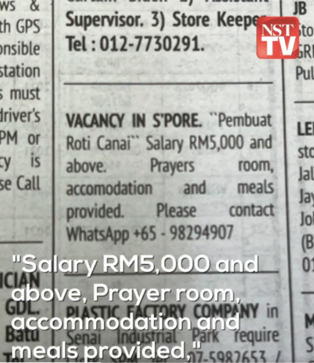 It read: Vacancy in S’pore. “Pembuat Roti Canai (Roti Canai Maker). Salary RM5,000 and above. Prayer room, accommodation, and meals provided. Please contact Whatsapp.”