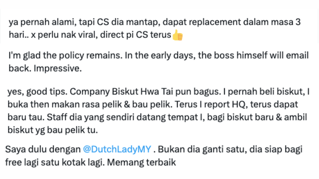 Other X users shared similar experiences with other brands, saying that Dutch Lady and HwaTai (biscuit company) also provided great customer service. One user even noted that the boss would email back in the early days. Another shared that there was no need to make such matters viral to shame the company when encountering the issue, but to do so directly to their Customer Service team.