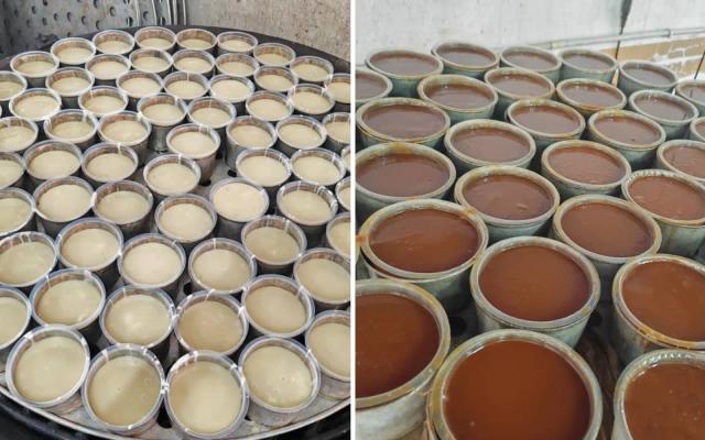 Next, sugar syrup is mixed with glutinous rice flour, and the mixture is carefully poured into the moulds. It would later be steamed for approximately 10 hours.