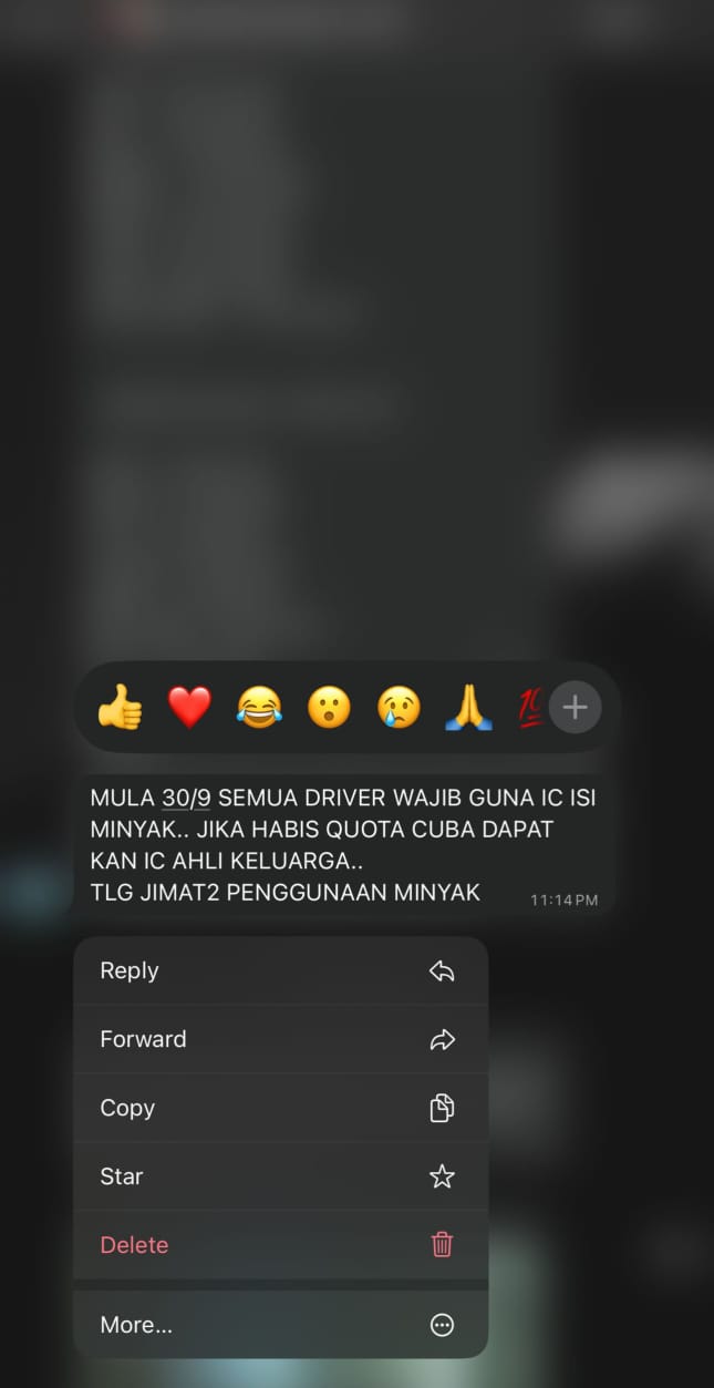 “Starting September 30, it's mandatory for all drivers to use their MyKad to refuel. If their quota has run out, try asking their family members for their MyKad. Please save on fuel.”