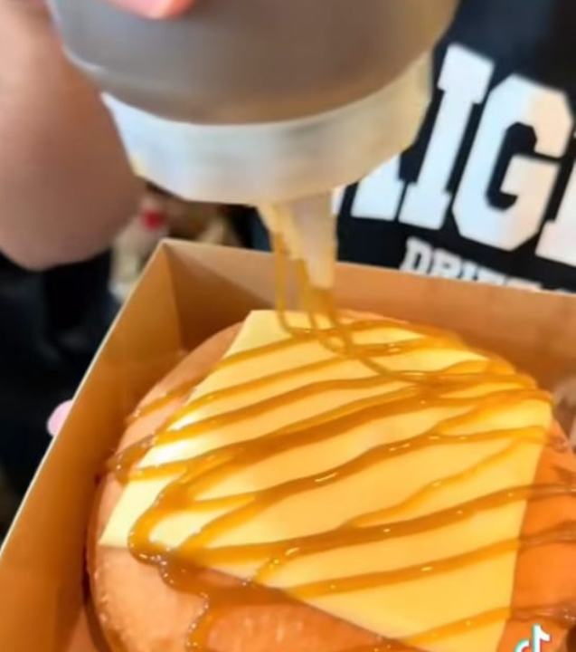 Based on a video, the preparation of the dessert is pretty straightforward: a slice of cheese is placed on a plain doughnut before it’s heated in a microwave. Some caramel sauce is then drizzled over the cheese doughnut.