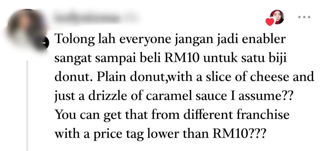 “Please everyone, don’t be an enabler for this RM10 doughnut. It’s just a plain doughnut with a slice of cheese and caramel drizzle, I assume? You can get that at a different franchise for less than RM10.”