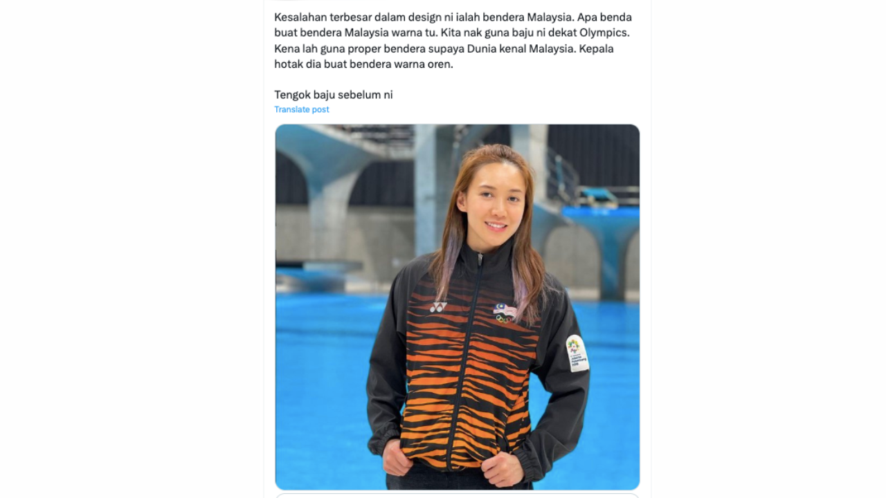 “The biggest mistake in this design is the Malaysian flag. Why is the Malaysian flag in such a colour? We will be wearing these clothes at the Olympics. You have to use a proper flag so that the world will know Malaysia… Look at the previous outfit,” said another.