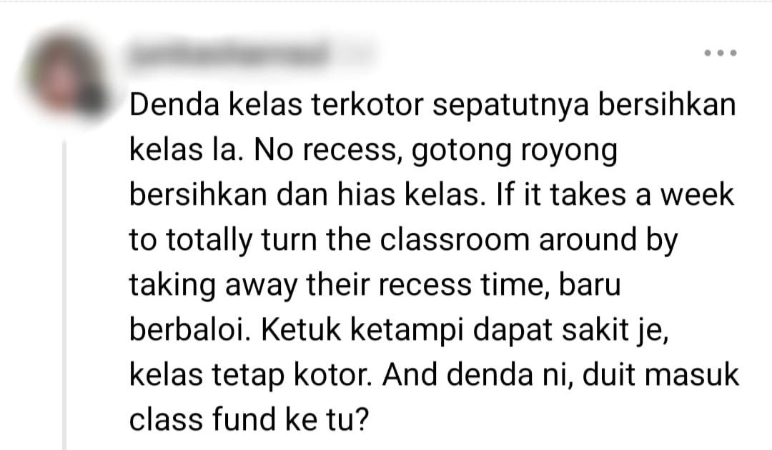 “The penalty for a dirty classroom should be cleaning it. No recess, and students should work together to tidy up. If it takes a week of missed recess to turn things around, that’s worth it. ‘Ketuk ketampi’ just causes pain. The classroom stays dirty. And the money, does it even go to a class fund?”